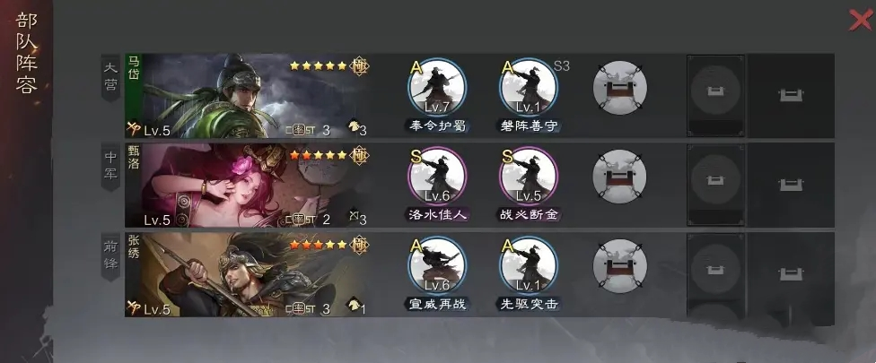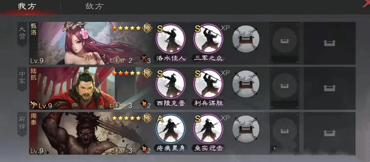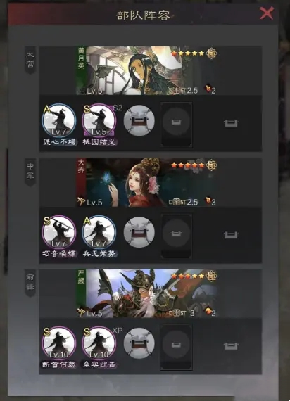这队的缺点便是后劲不足,打城抢榜困难,而且需求的战法经验相对较多,对于荣誉/虎符开荒玩家来说,也是可以选择的。