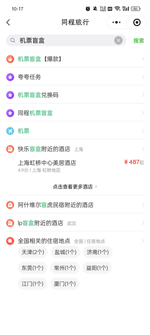 2、在小程序的首页进行搜索,找到【机票盲盒】点击进入。