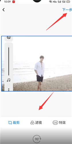 可以在下面选择裁剪、滤镜、特效美化图片,设置好后点击右上角的下一步,
