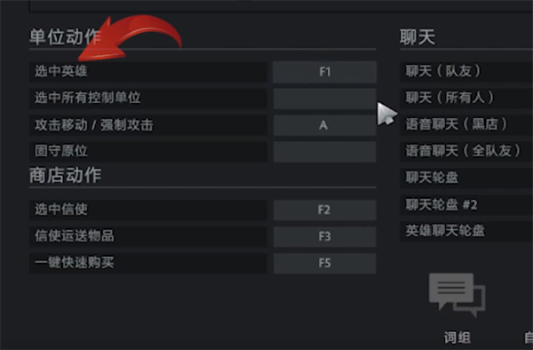 2.在设置页面中再点击上方的【热键】选项,在下方单位动作栏目中设置【选中英雄】的具体按键,一般默认按键是F1.设置完成之后dota2就可以通过按住F1键来保持游戏视角跟随英雄。但是只能在按住F1时才能保持视角跟随,并不能设置让视角始终跟随,大多数情况下只能使用手动拖动屏幕来控制视角。因为dota2与一些moba游戏在游戏内核上有相当的不一样,很多操作都需要在游戏屏幕外进行,所以想要正常游玩还是需要摒弃固定视角的习惯。