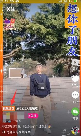 2、打开之后,刷视频注意看到有,左下角视频红包的样式的才会有红包。